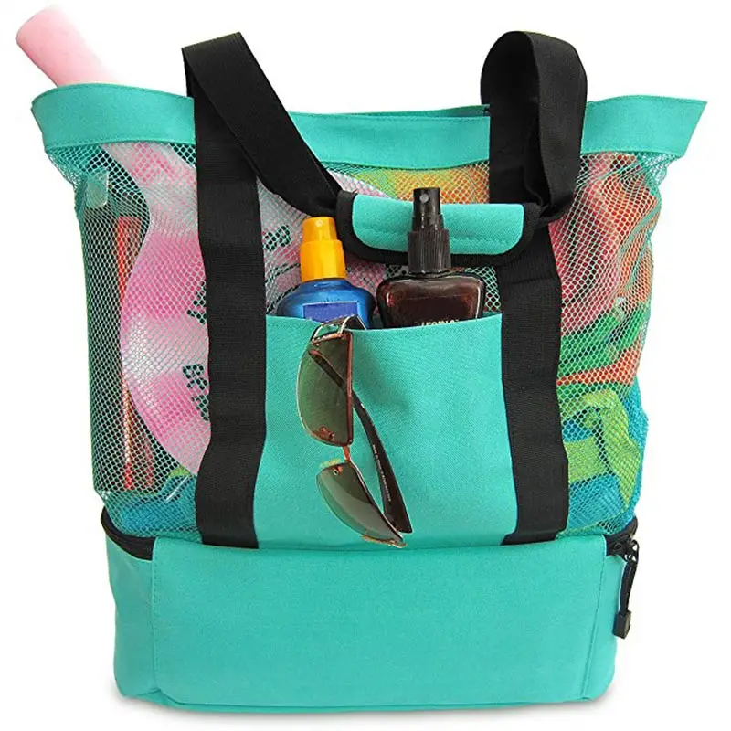 استعارات ل جديد قدرة كبيرة في الهواء الطلق المحمولة حافظة للمثلجات معزولة حراريًا الغذاء نزهة الشاطئ حقائب من القماش الشبكي مع سستة حقيبة يد للماء تخزي...