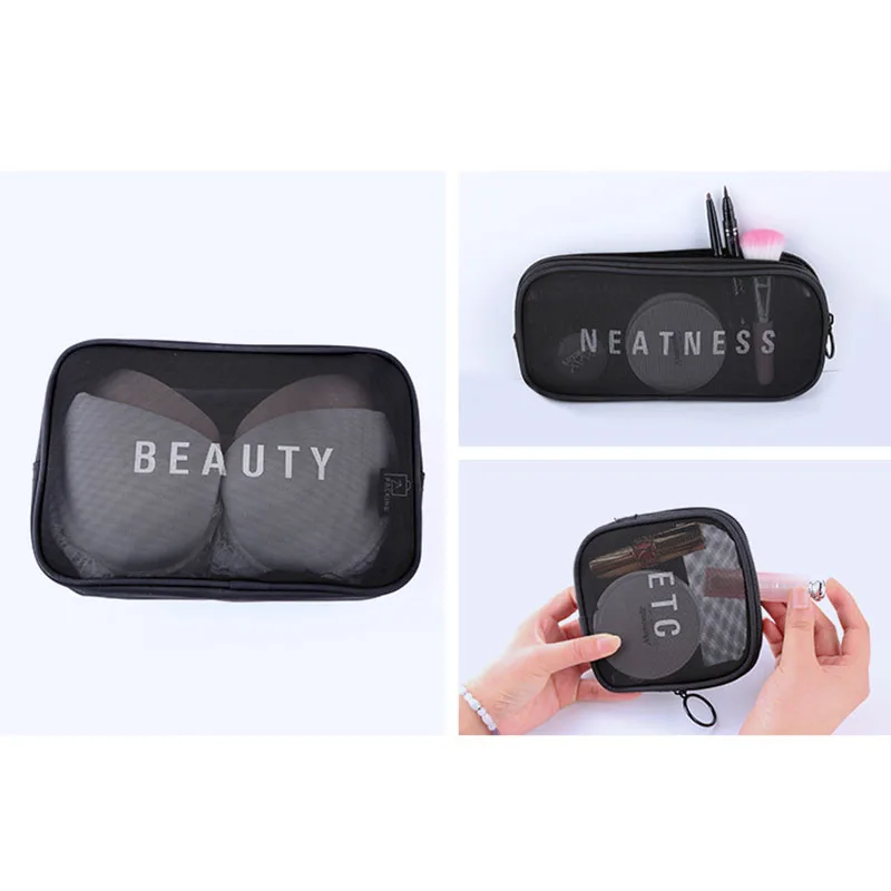 صور من شفافة شبكة التخزين المنظم التجميل تخزين حقيبة السفر المحمولة غسل اضح الضرورات ماكياج غسل أدوات الزينة حقيبة